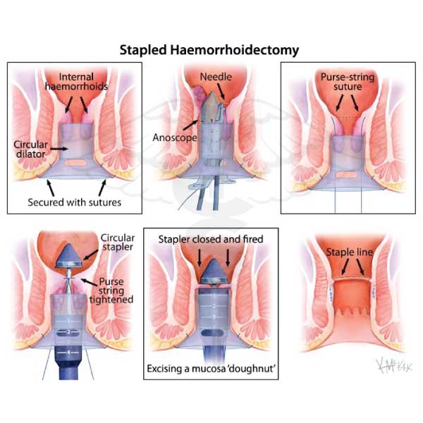 Operasi ambeien atau wasir dalam bahasa medis disebut dengan hemoroidektomi. Tindakan awalnya dengan pembiusan lokal ataupun total tergantung kondisi pasien. Lalu dipotong bagian yang daging yang keluar kemudian dijahit. Saat melakukan operasi dokter spesialis bedah pencernaan akan menggunakan stepler khusus untuk mengingat pembuluh darah agar mengurangi terjadinya pendarahan.